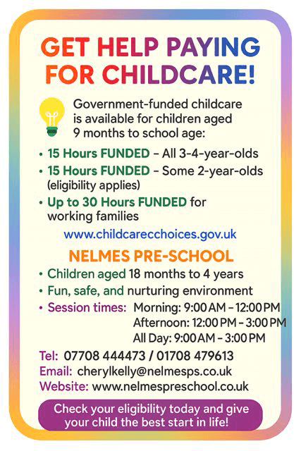Nelmes Pre-School accepts government funding for 9 months +, two, three and four year olds. This includes the Universal 15 hours and, for eligible families, the extended 30 hours. Parents are responsible for paying fees for any additional hours beyond the funded entitlement.
